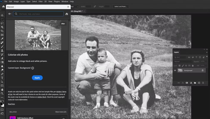 在“探索”面板中,导览至“浏览 > 快速动作”,然后选取“为旧相片上色”。